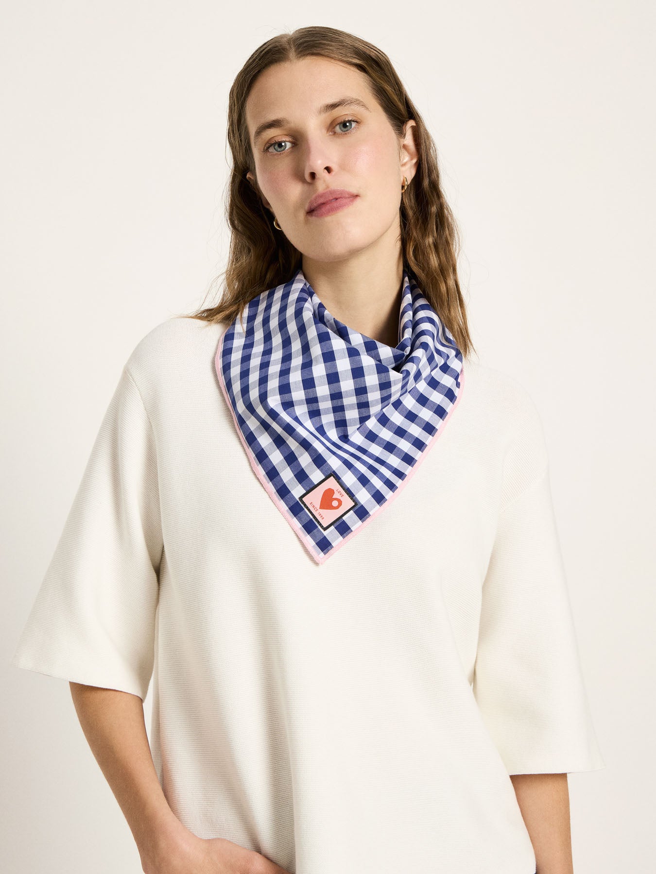 Eine fein umsteppte Zierkante unterstreicht die hochwertige Verarbeitung, während der „LOVE“-Aufnäher einen dezenten, modernen Akzent setzt. Mit seiner Kombination aus nachhaltigem Material, klassischem Design und vielseitiger Tragbarkeit ist das Vichy-Karo Tuch ein stilvolles Detail, das jede Garderobe bereichert.