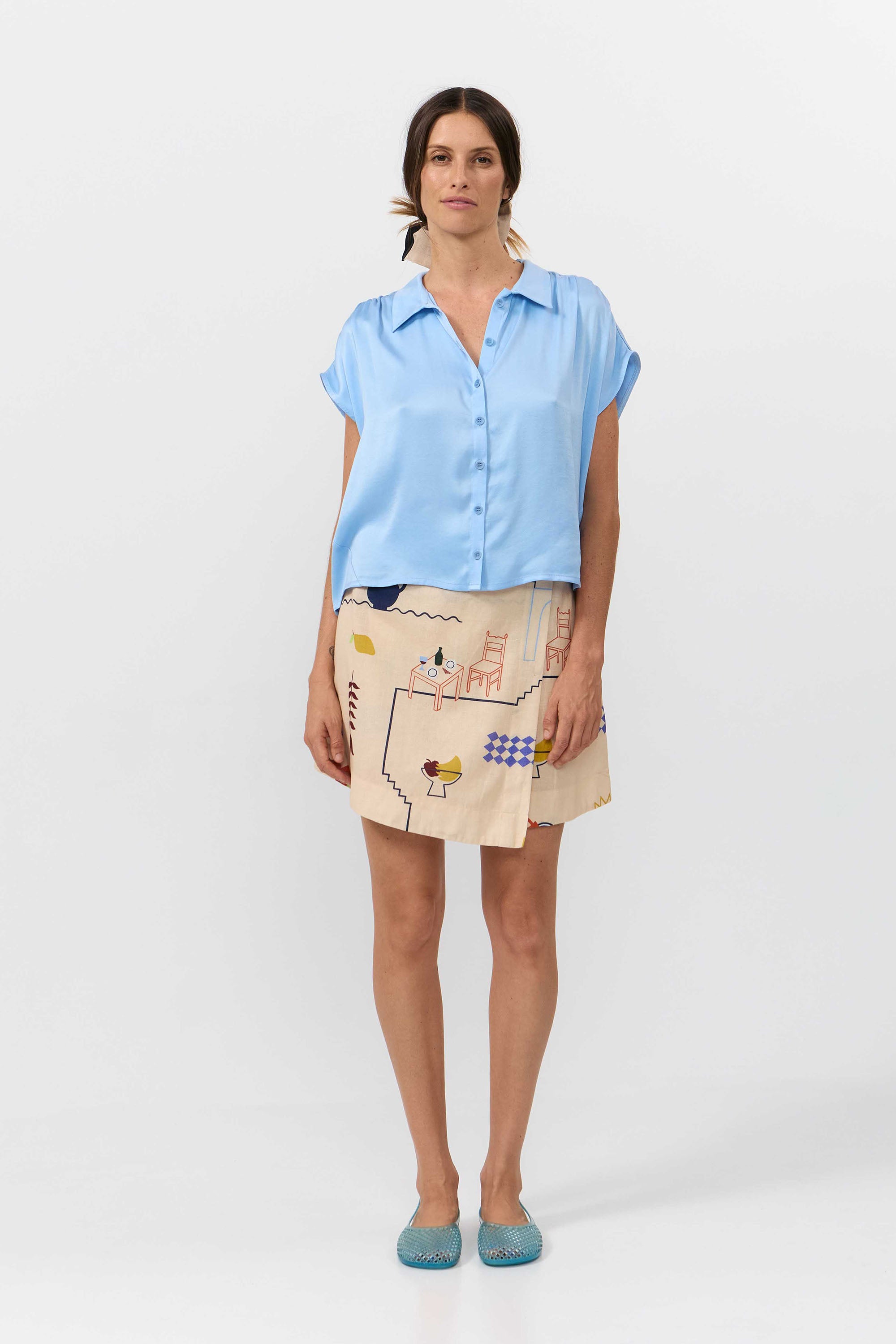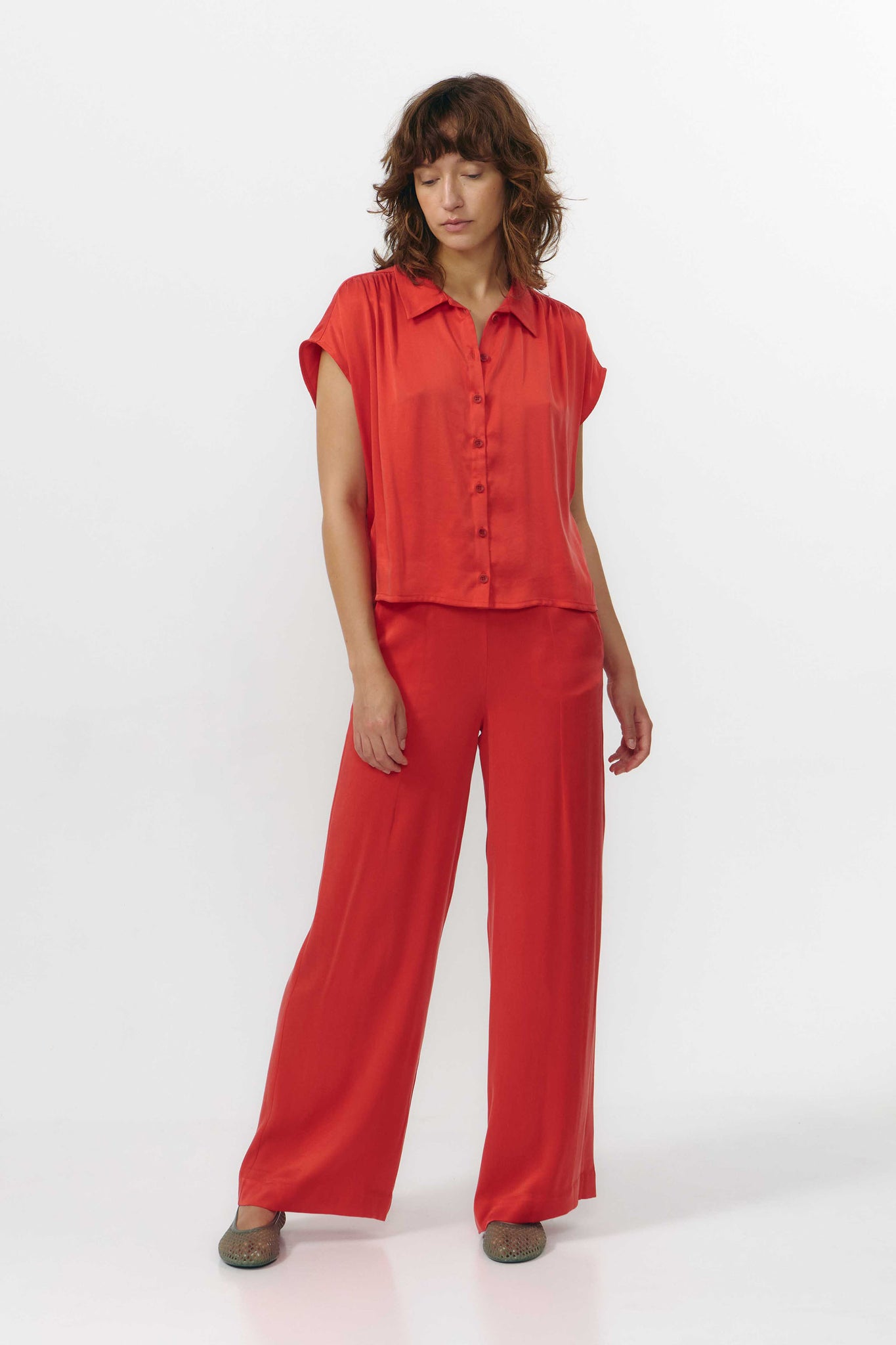 Das SUR Shirt ist ein modernes Cupro-Hemd, das durch seine entspannte Passform und komfortable Trageeigenschaften überzeugt. Die kurz geschnittenen Ärmel, die leicht unter die Schulter fallen, verleihen dem Hemd eine lockere, sommerliche Silhouette, während die geraffte Schulternaht subtile Details und eine sanfte Struktur ins Design bringt.