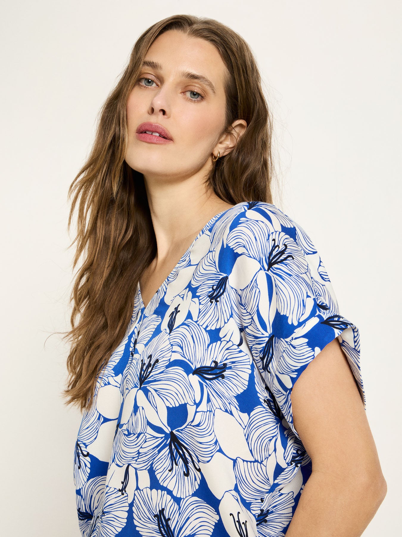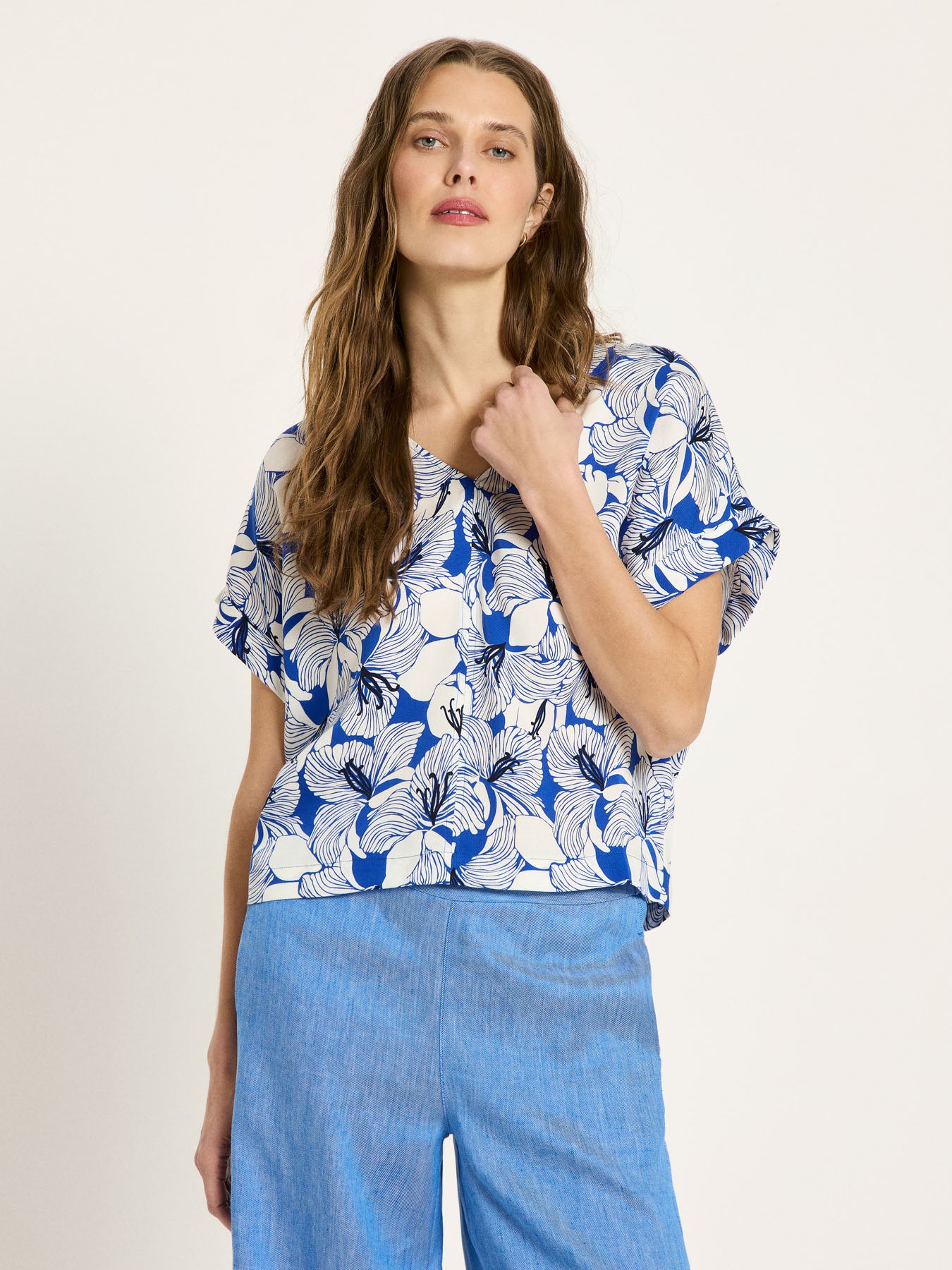 Dieses Blusenshirt aus 100 % TENCEL™ Lyocell vereint einen modernen Print mit einer lässig-eleganten Silhouette und nachhaltiger Qualität. Der fließende Stoff fällt besonders weich, fühlt sich angenehm kühl auf der Haut an und überzeugt durch seine atmungsaktiven, temperaturausgleichenden Eigenschaften. Dadurch ist das Shirt ideal für warme Tage geeignet und funktioniert zugleich als unkompliziertes Key-Piece im Layering.