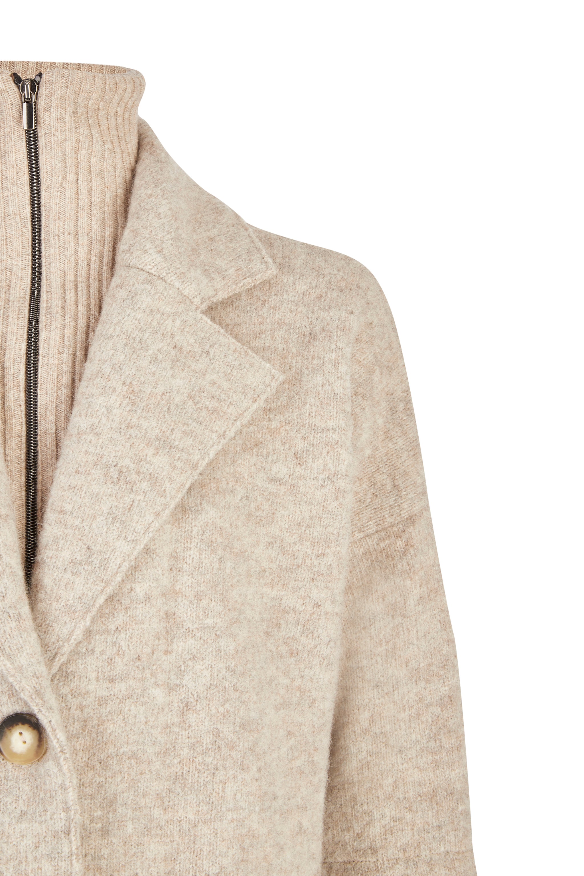 Dieser Damenmantel überzeugt durch eine klassische Form, die mit raffinierten Details neu interpretiert wurde. Gefertigt aus hochwertigem Shetlandwalk, bietet er angenehme Wärme und einen zeitlosen Look. Besonderes Augenmerk verdienen die Einsätze aus weichem Merinostrick, die unter dem Reverskragen sowie an den Ärmeln verarbeitet sind. Sie sorgen nicht nur für ein angenehmes Tragegefühl, sondern setzen auch stilvolle Akzente. Die lässig überschnittenen Schultern und die großzügige Silhouette verleihen dem Mantel eine moderne, entspannte Ausstrahlung. Schmale Strickstulpen an den Ärmeln bilden einen spannenden Kontrast und runden das Design harmonisch ab. Praktische Einschubtaschen an den Seiten bieten Platz für Kleinigkeiten oder warme Hände. Gestrickt in Wörgl in Tirol, steht dieses Modell für nachhaltige Qualität, sorgfältige Verarbeitung und zeitloses Design – typisch Stapf. Made in Austria.