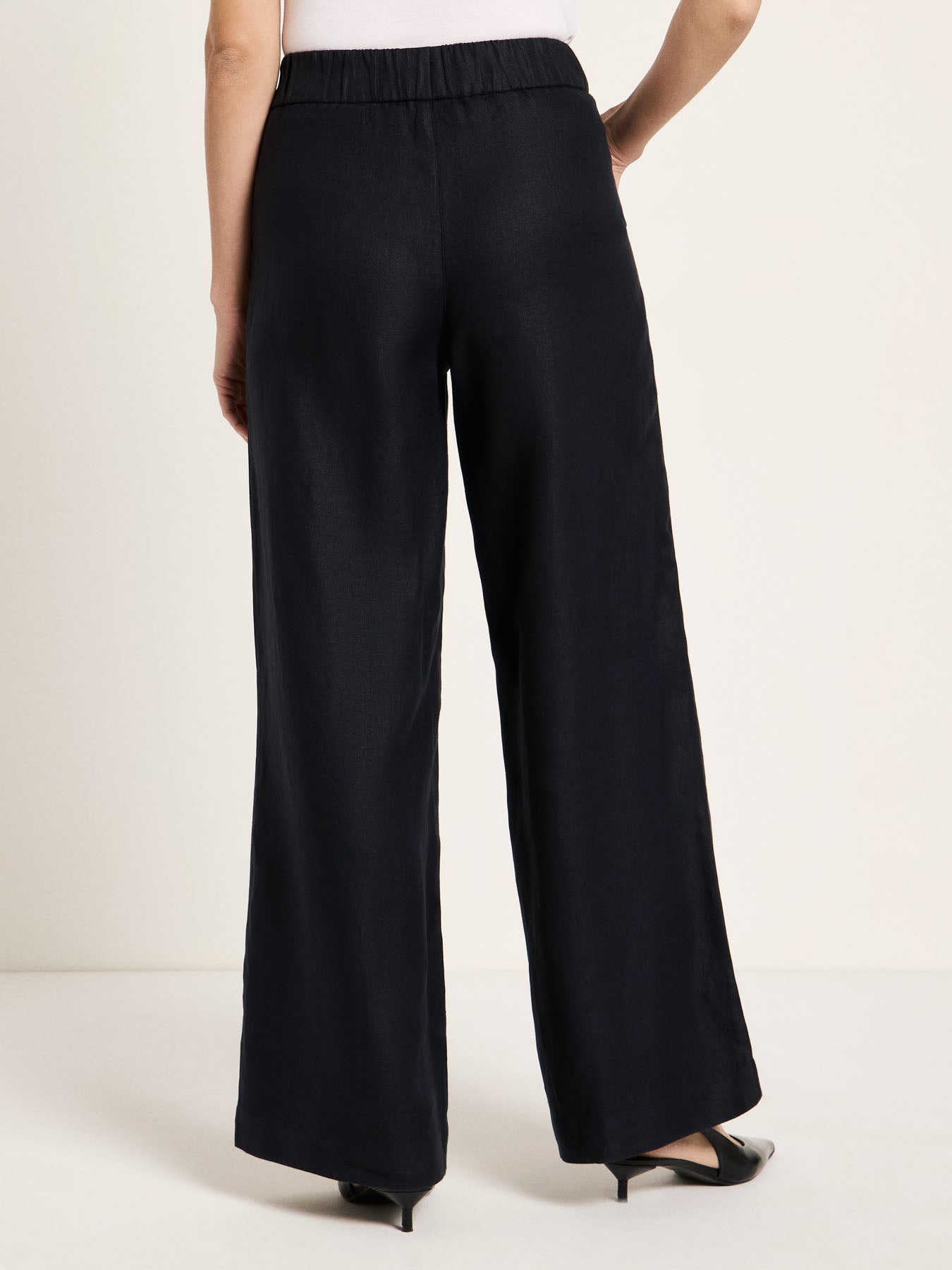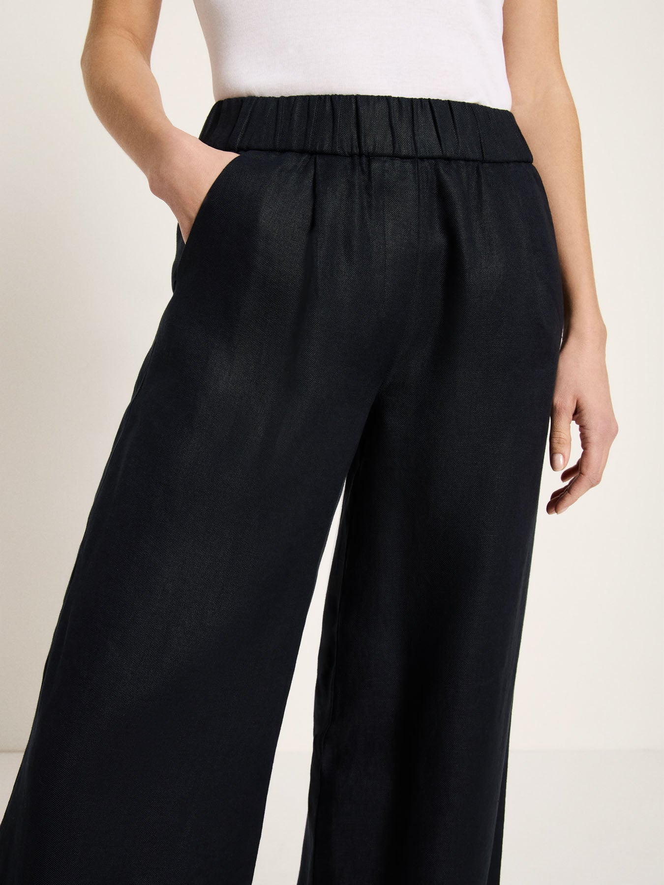Der weite Schnitt verleiht der Leinenhose eine fließende, feminine Silhouette und bietet maximale Bewegungsfreiheit. Die High-Waist-Passform betont die Taille und sorgt für eine moderne, stilvolle Ausstrahlung. Ein breiter Gummibund garantiert zusätzlichen Komfort und eine flexible Passform, während französische Taschen das Design funktional und zugleich elegant abrunden.