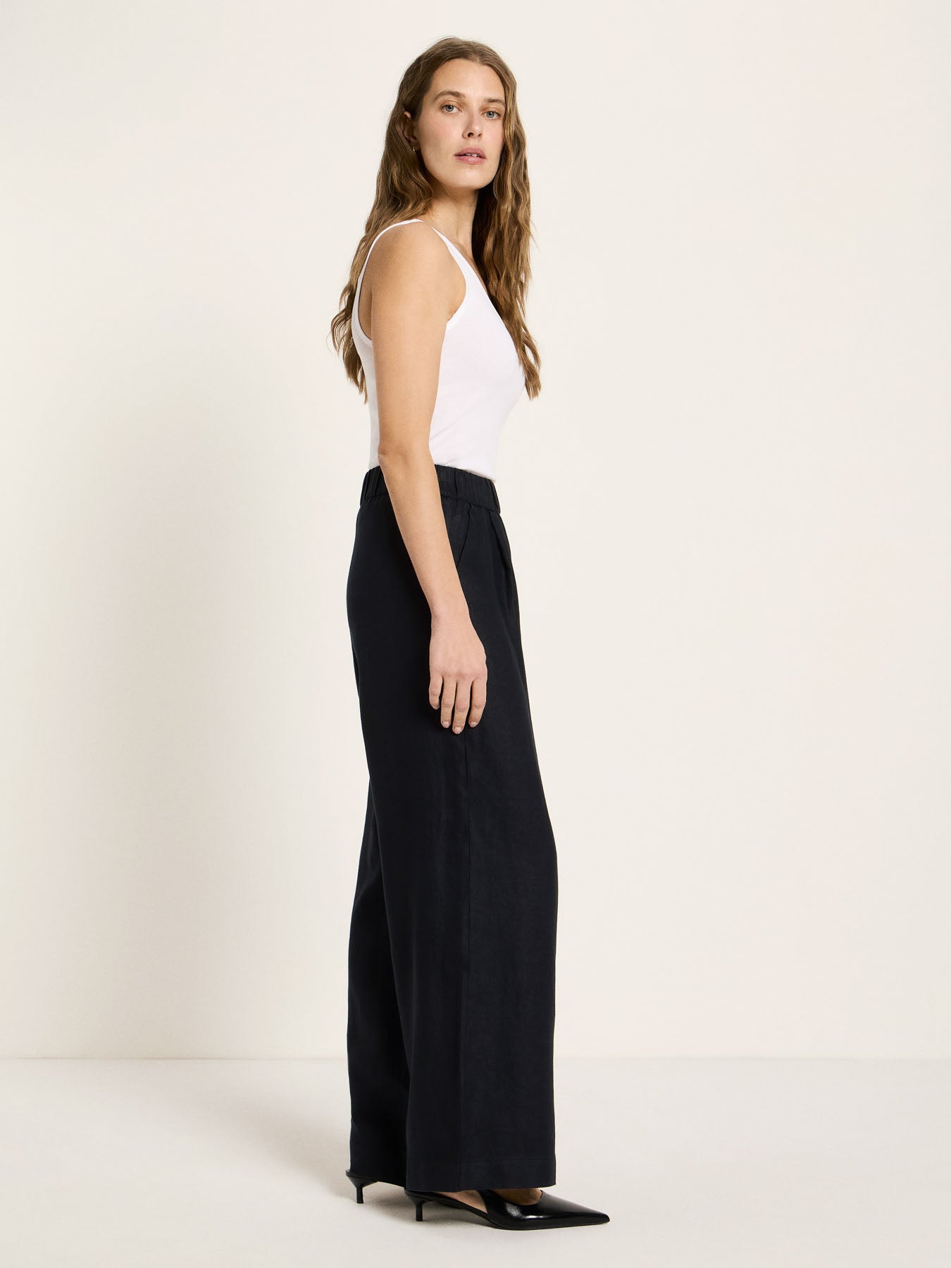 Ob puristisch kombiniert mit Top und Sandalen, als smarter Office-Look mit Bluse oder als ausdrucksstarkes Set mit passendem Blazer – diese Hose aus Bio-Leinen ist vielseitig tragbar und passt sich unterschiedlichsten Anlässen mühelos an. Ein nachhaltiges Wohlfühl-Piece, das Stil, Komfort und Umweltbewusstsein harmonisch miteinander verbindet.