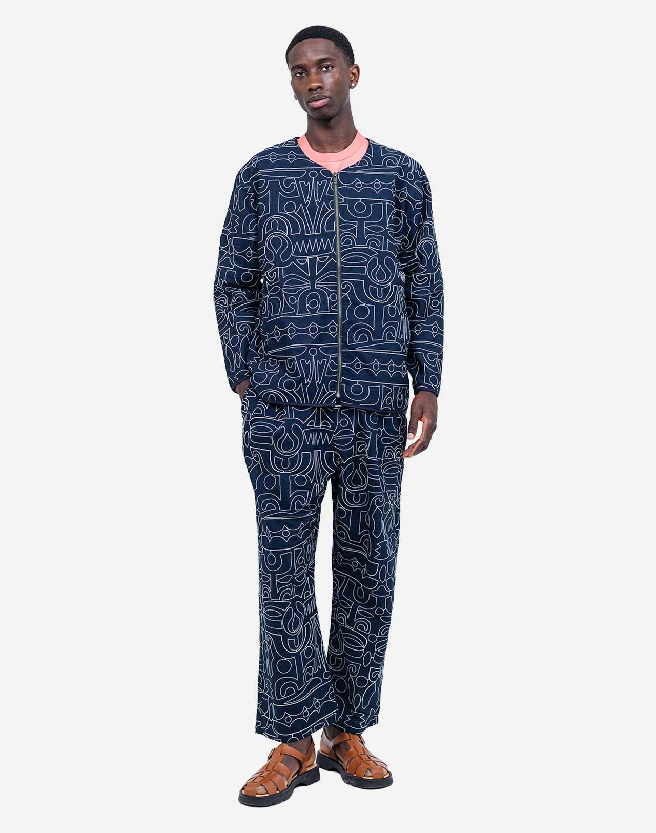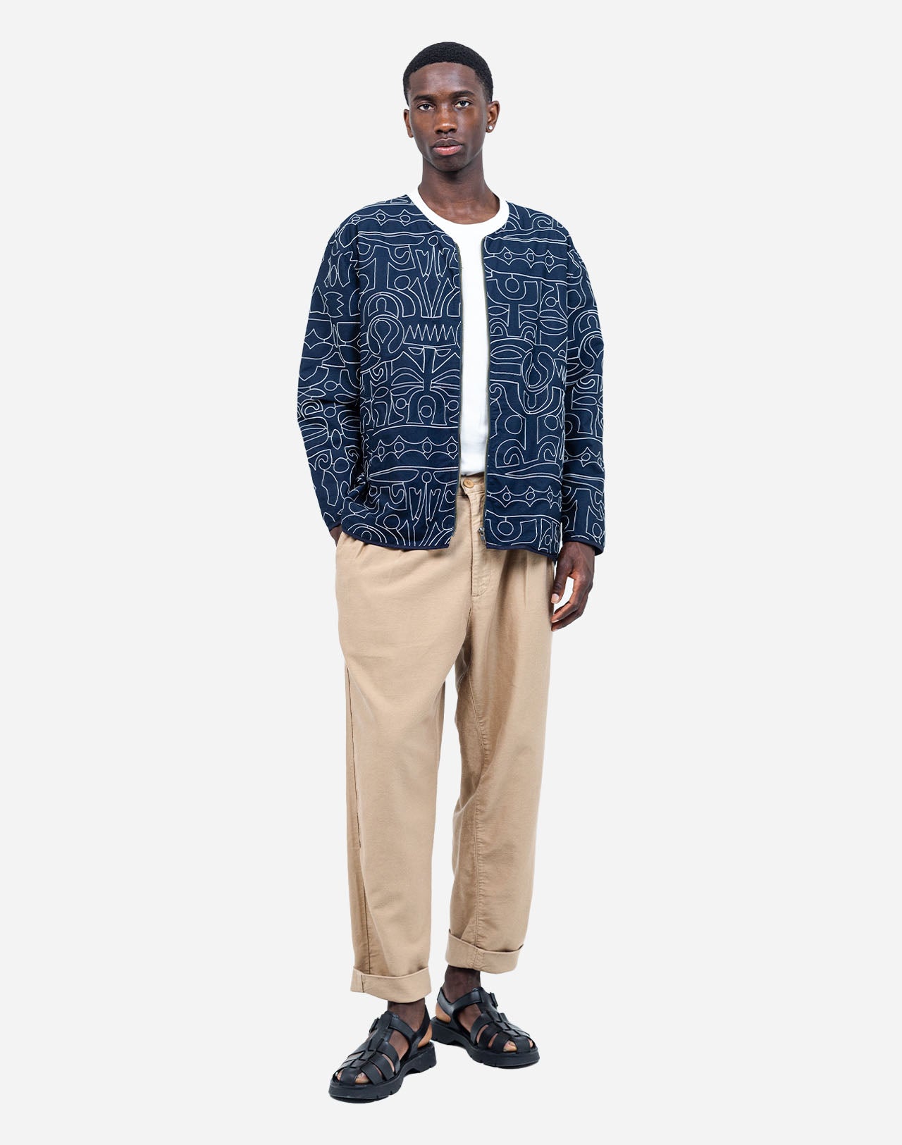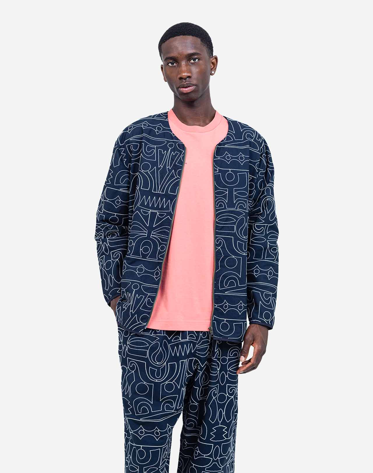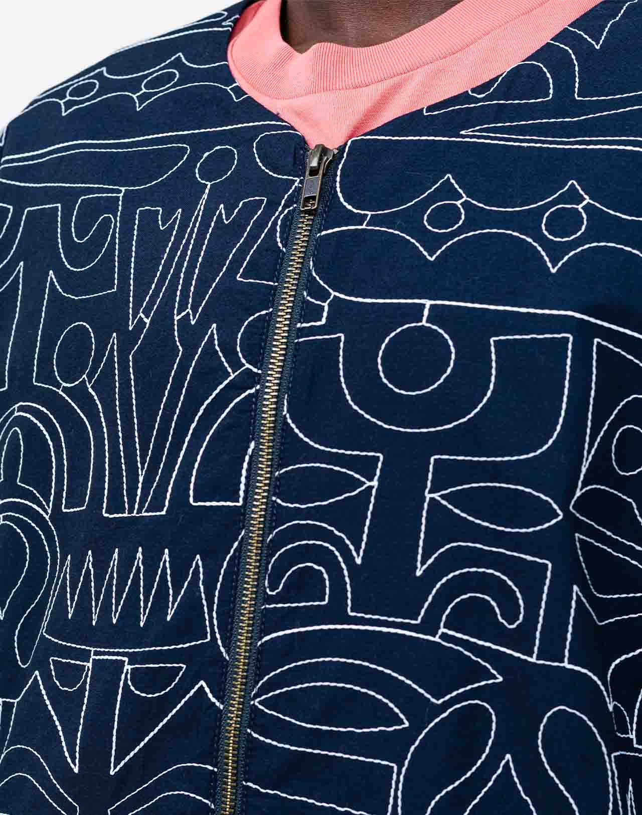 Die Ostara Palang Jacke in Nachtblau ist ein markantes Statement-Piece, das künstlerisches Design mit hochwertiger Verarbeitung verbindet. Der unverwechselbare Strich des Künstlers Jeykill ist als All-over-Stickerei auf der Jacke umgesetzt und verleiht ihr einen dynamischen, individuellen Charakter. Die Kombination aus tiefem Nachtblau und ecruer Stickerei sorgt für harmonische Kontraste und macht das Modell vielseitig kombinierbar – sei es zu kräftigen Farben, klassischer Denim oder im Ton-in-Ton-Look mit der passenden Hose.