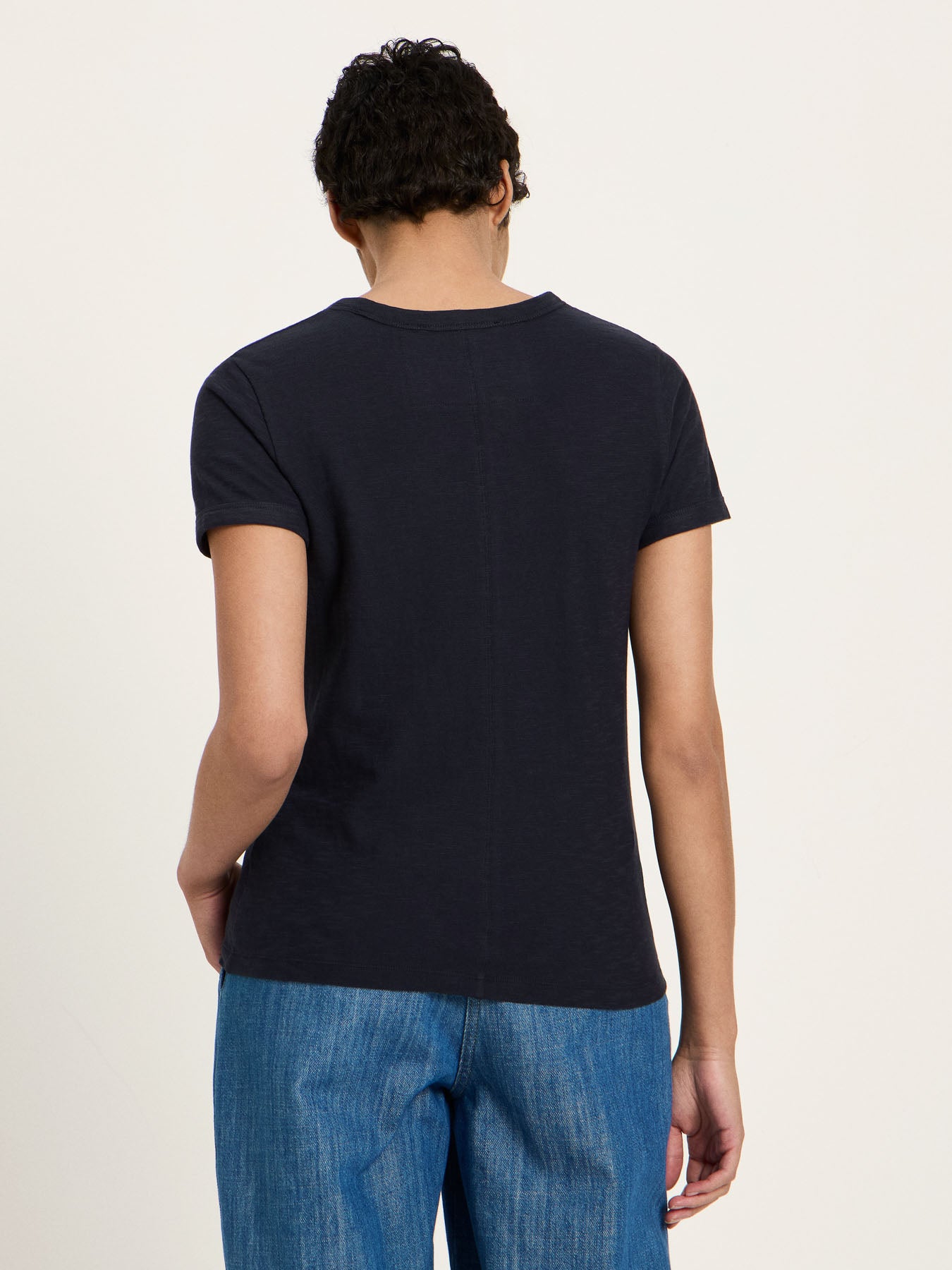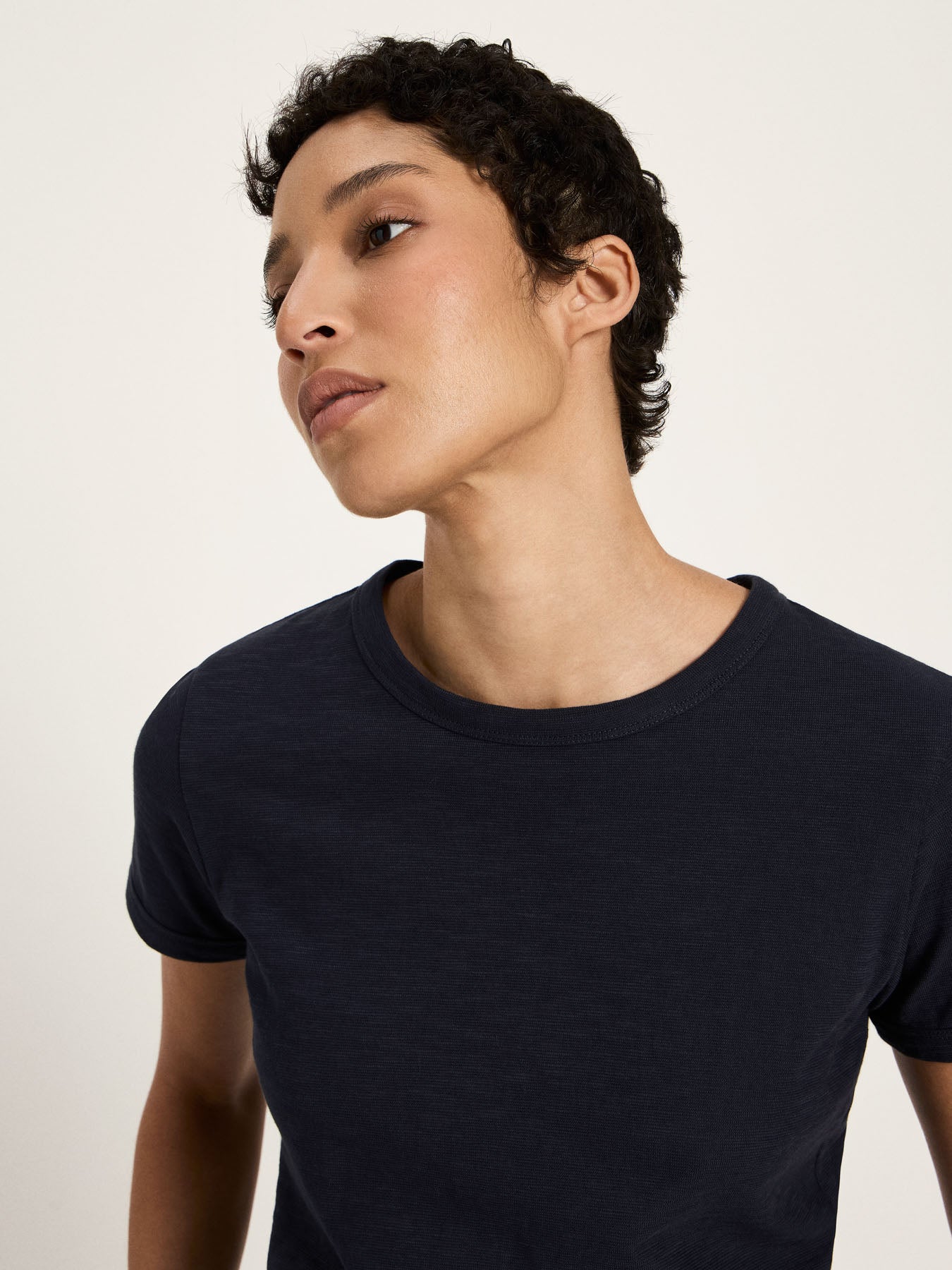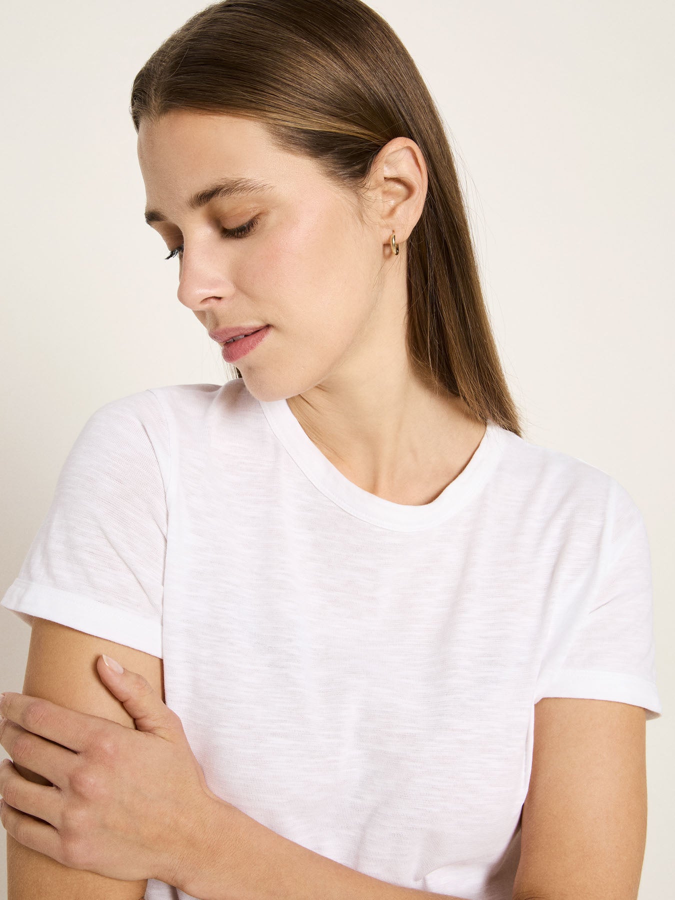Die figurbetonte Passform unterstreicht die Silhouette, ohne einzuengen, während der klassische Rundhalsausschnitt und die kurzen Ärmel das puristische Design abrunden. Ob solo getragen zu Jeans, Rock oder Stoffhose oder als unkomplizierte Basis unter Blazern, Jacken und Strick – dieses Kurzarmshirt lässt sich mühelos kombinieren und passt sich jedem Stil an.