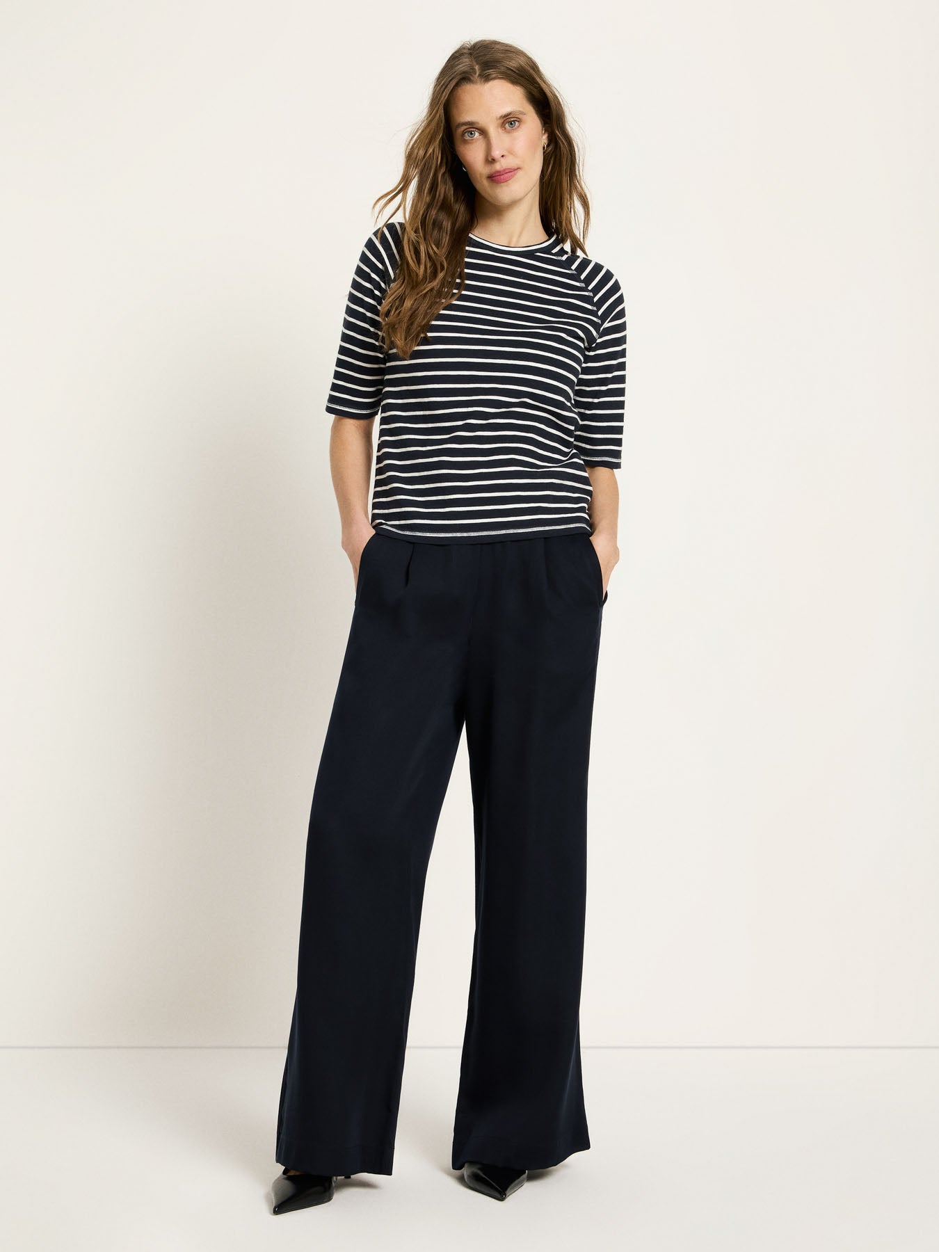 Leinen ist ideal für warme Temperaturen: Es wirkt temperaturregulierend, nimmt Feuchtigkeit schnell auf und trocknet zügig. Die Produktion von Leinen benötigt vergleichsweise wenig Wasser und Pestizide – das macht es zu einer umweltfreundlichen Wahl.