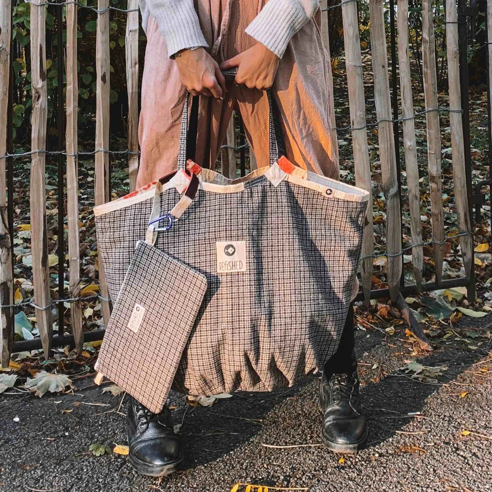 upcycelte Fischfuttersäcke und upcycelter Tweed-Stoff