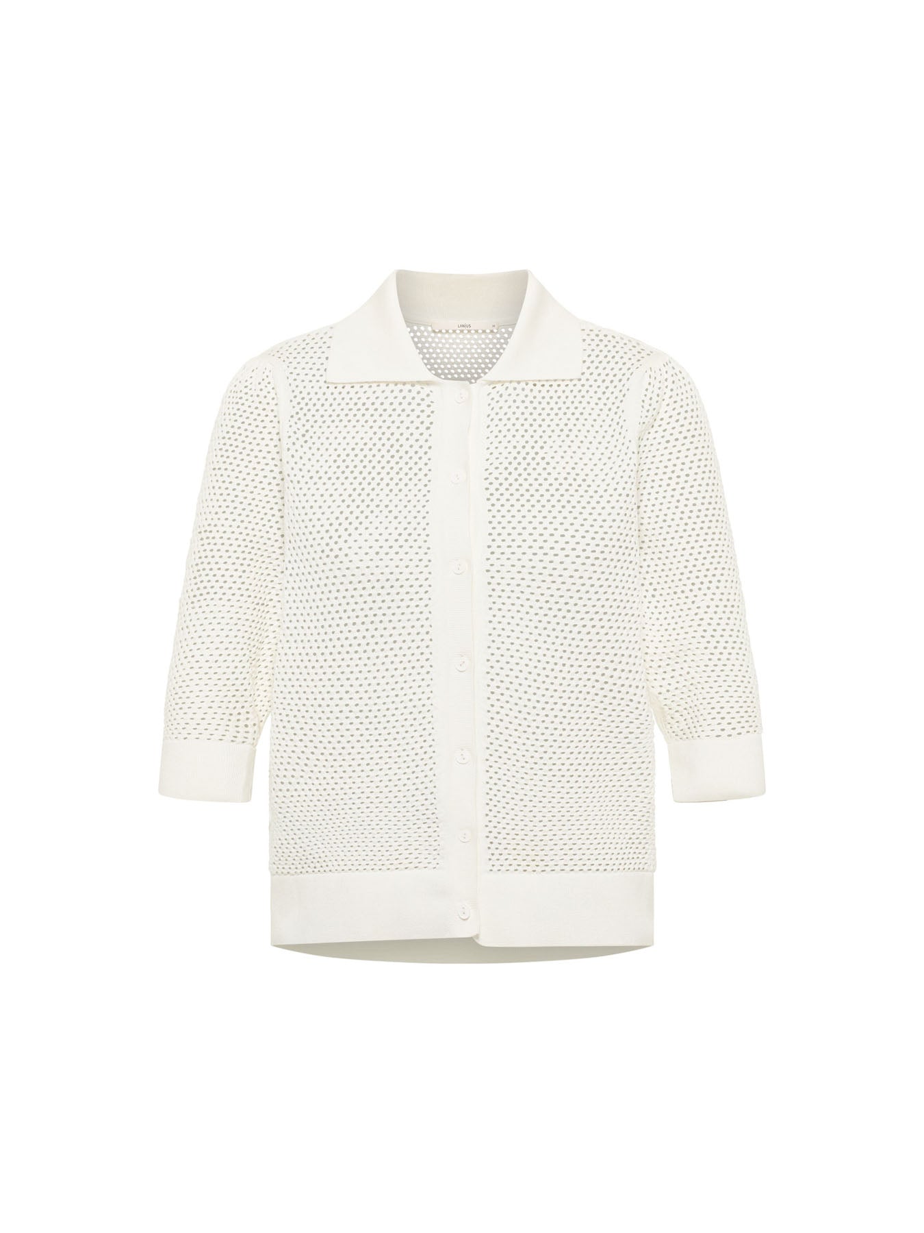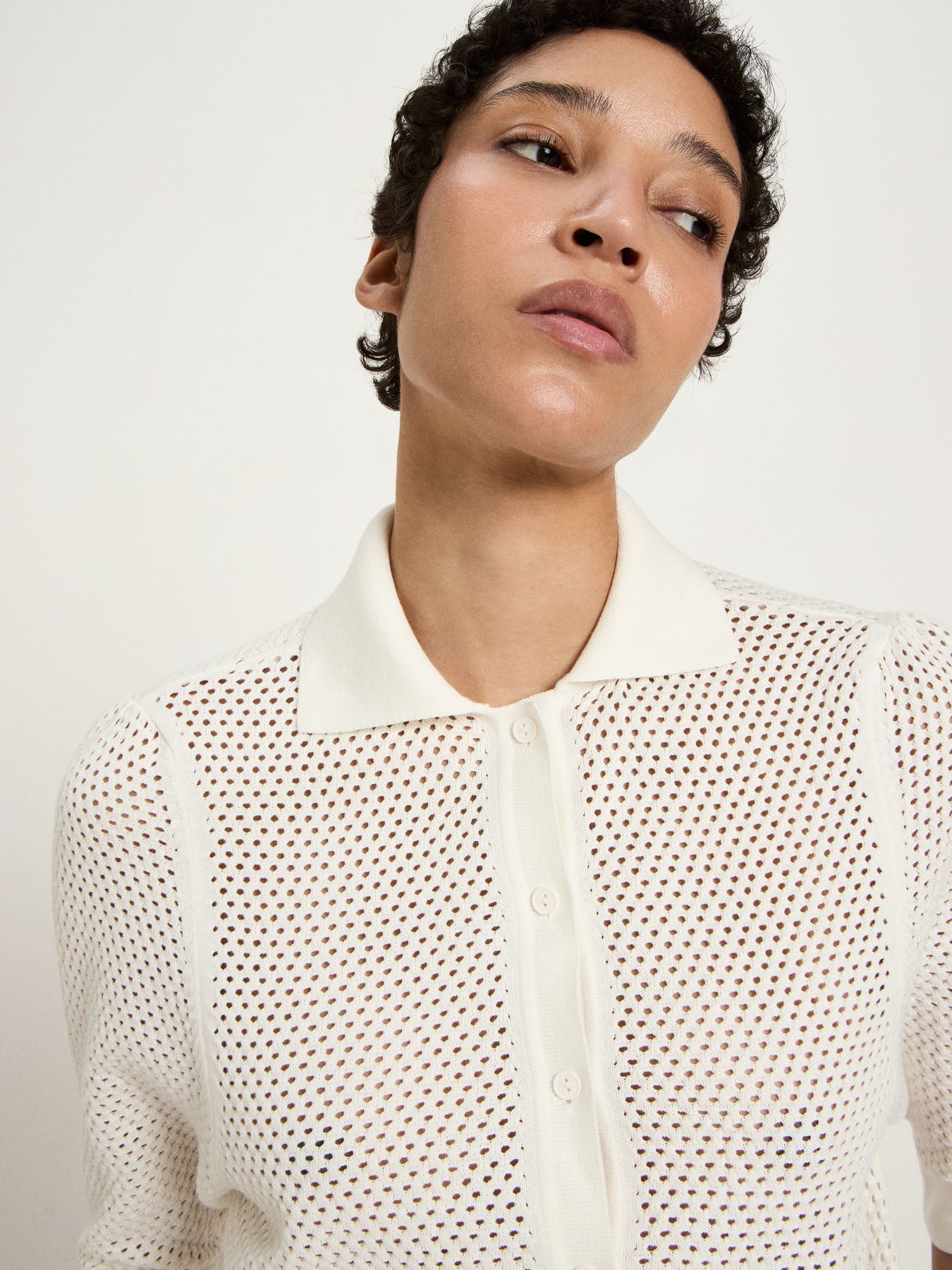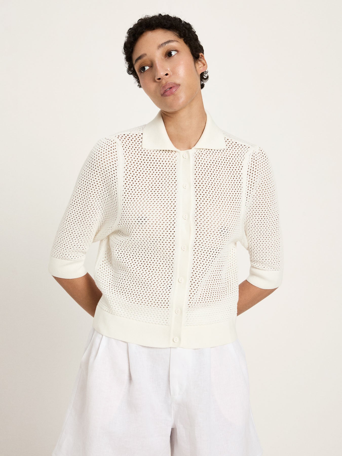 Der Polokragen verleiht dem Design eine cleane, leicht sportive Note, während die Knopfleiste vielseitige Stylingmöglichkeiten bietet. Ob offen als leichter Cardigan oder geschlossen als Strick-Top getragen – dieses Piece passt sich deinem Look flexibel an. Der moderne, kurze Schnitt in Kombination mit der locker sitzenden Passform sorgt für eine zeitgemäße Silhouette, während elastische Bündchen den Tragekomfort zusätzlich unterstreichen.