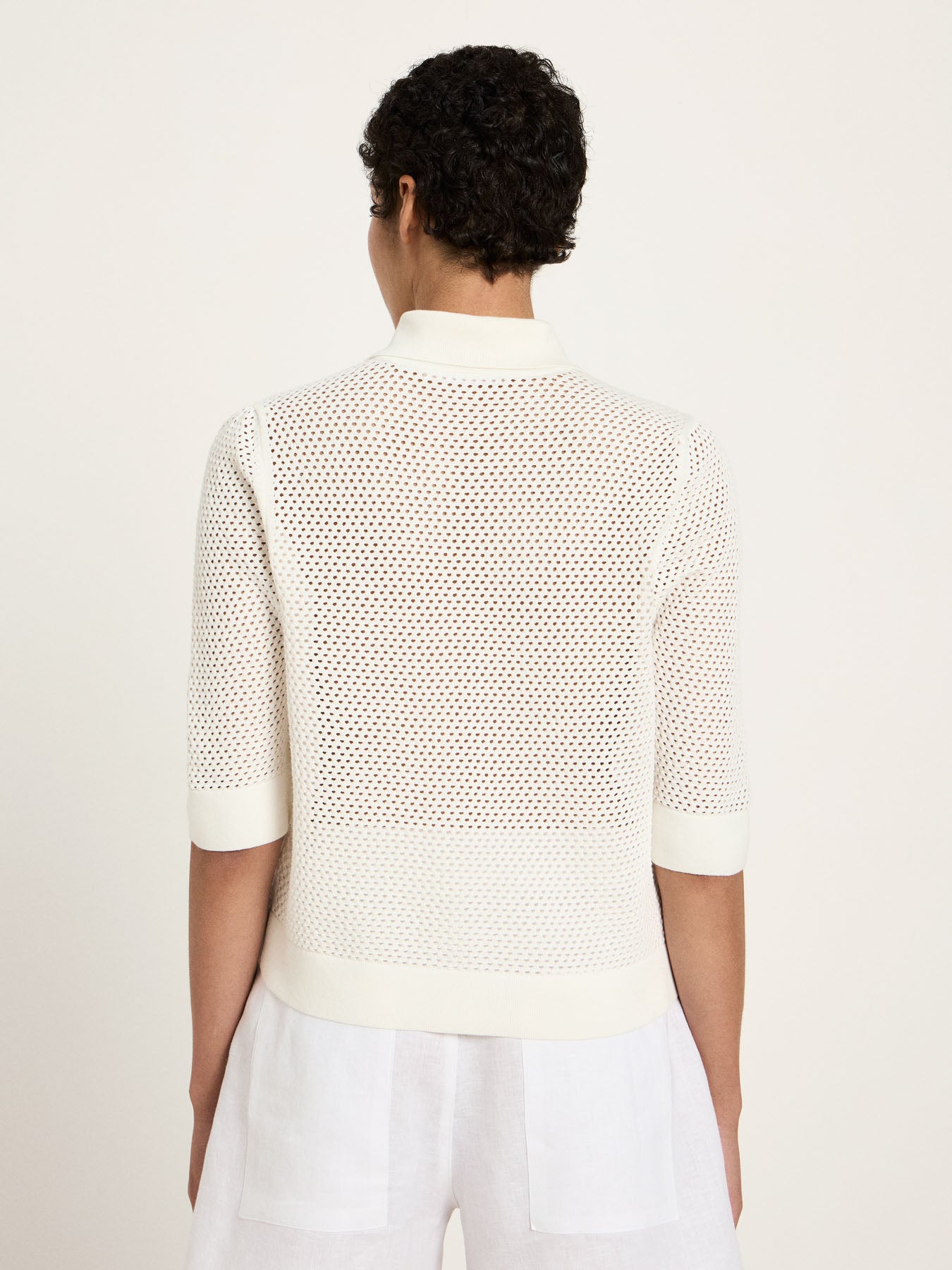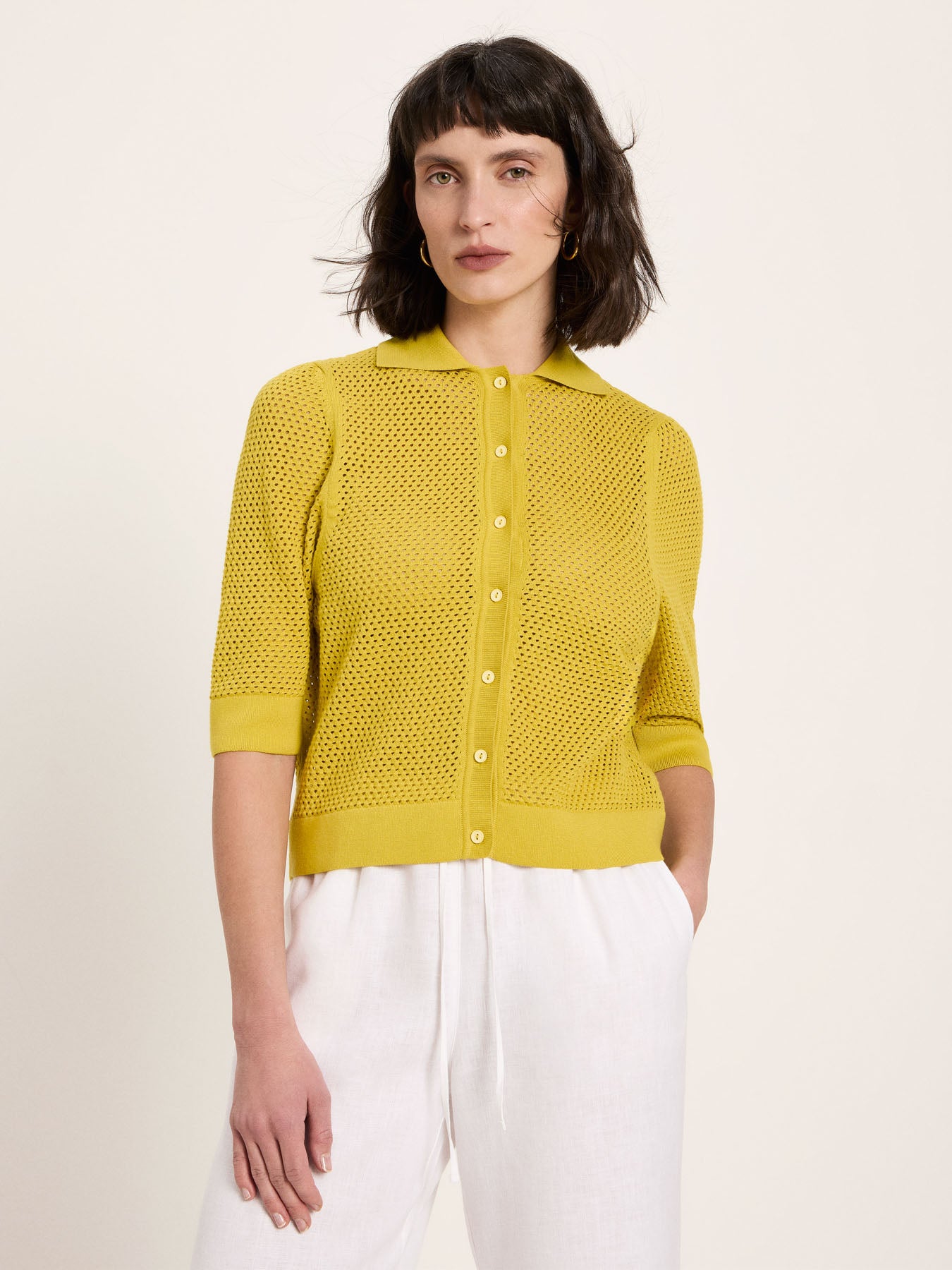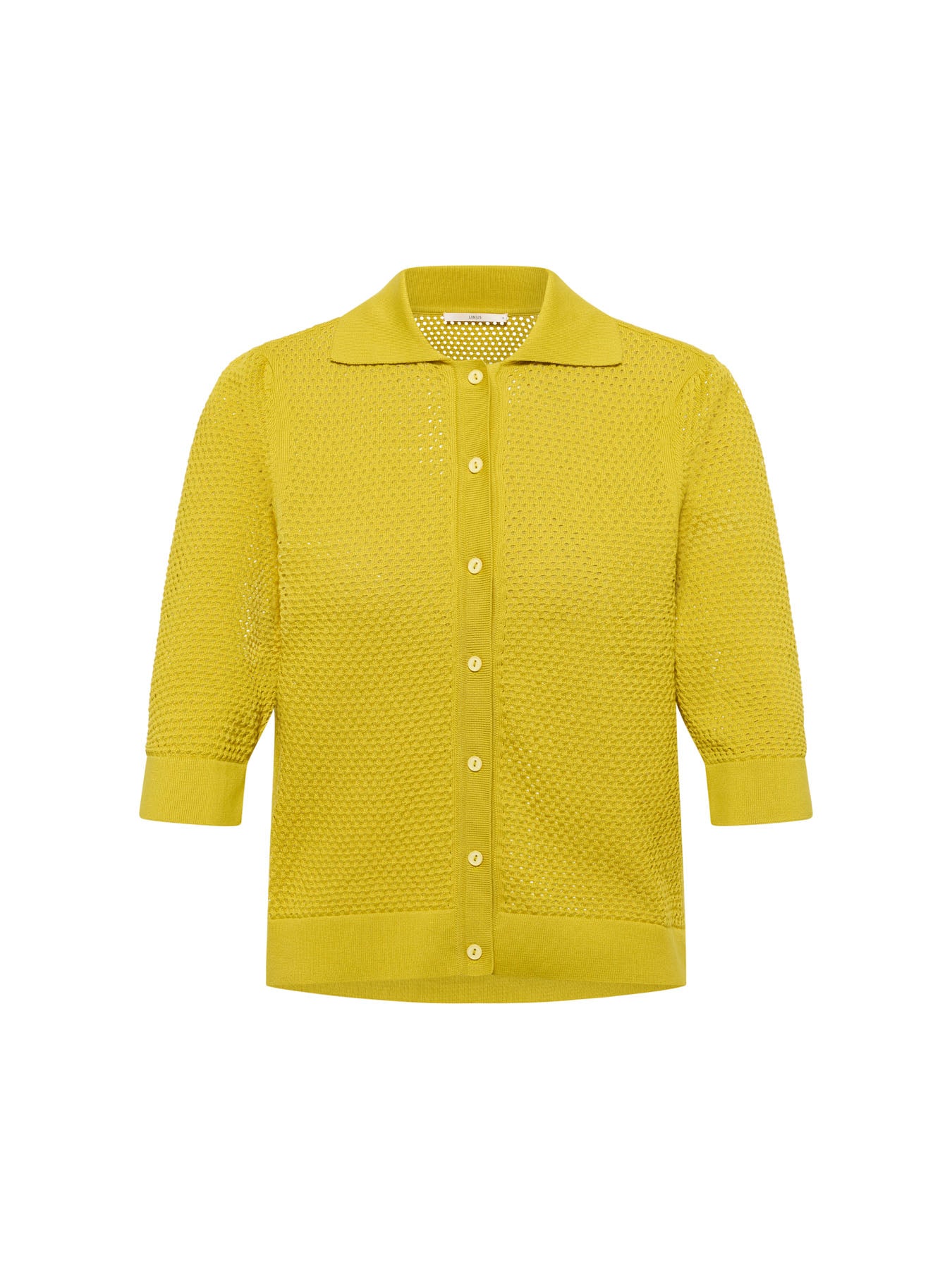 Der Polokragen verleiht dem Design eine cleane, leicht sportive Note, während die Knopfleiste vielseitige Stylingmöglichkeiten bietet. Ob offen als leichter Cardigan oder geschlossen als Strick-Top getragen – dieses Piece passt sich deinem Look flexibel an. Der moderne, kurze Schnitt in Kombination mit der locker sitzenden Passform sorgt für eine zeitgemäße Silhouette, während elastische Bündchen den Tragekomfort zusätzlich unterstreichen.