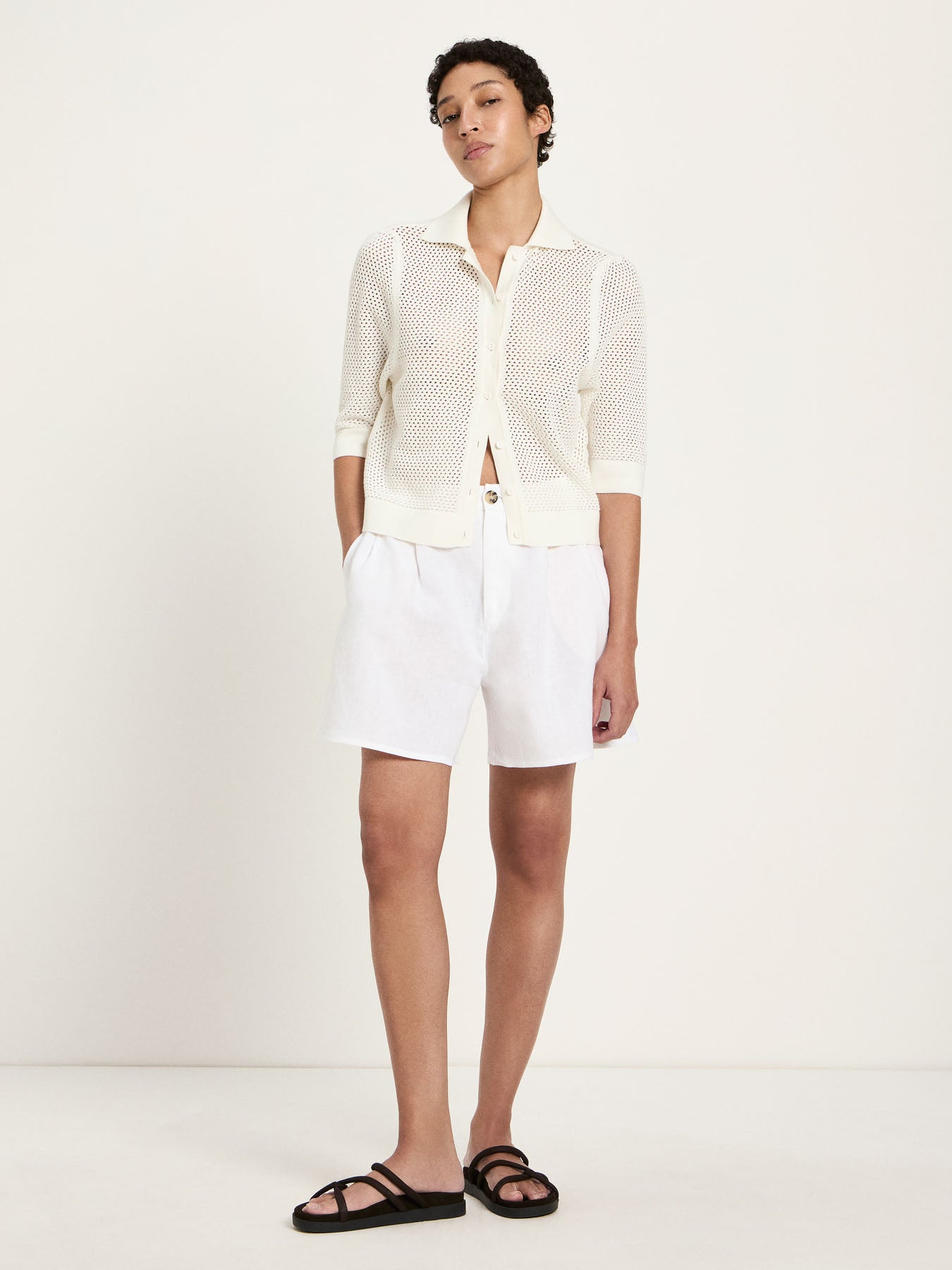 Die kurzärmelige Strickjacke aus der limitierten LANIUS x MARIE NASEMANN „Lago di Garda Edizione“ vereint sommerliche Leichtigkeit mit modernem Design. Inspiriert von entspannten Tagen am Gardasee bringt sie mediterranes Flair und zeitlose Eleganz in deine Garderobe.