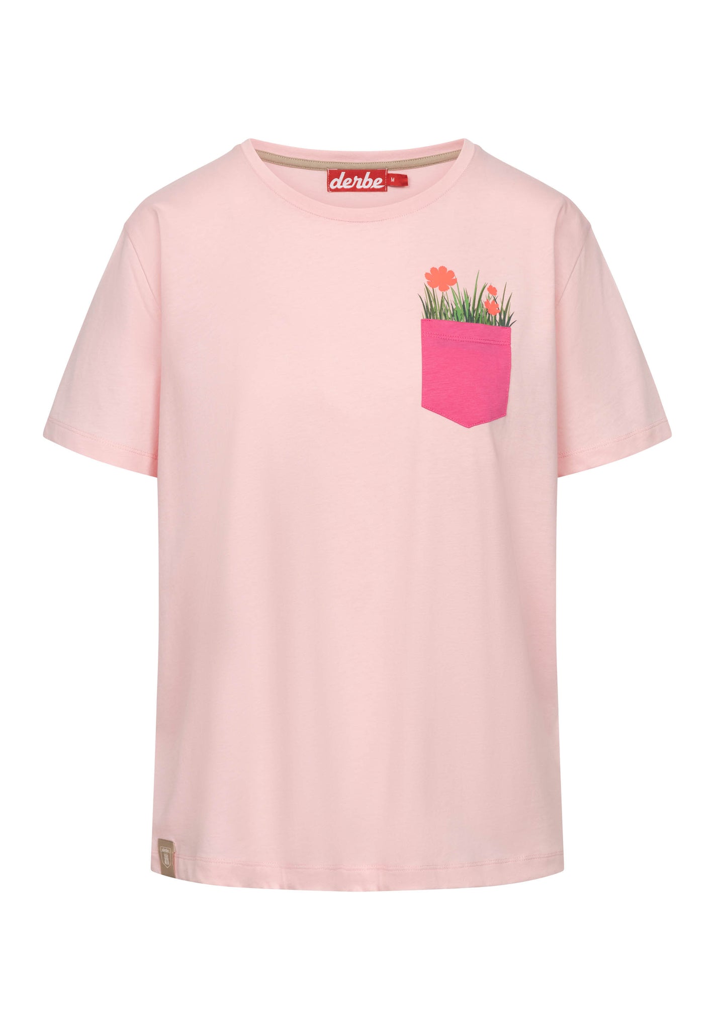 Das Dünenblümchen Damen T-Shirt in Coral Blush Rosa von der Marke Derbe überzeugt durch ein verspieltes Design und hohen Tragekomfort. Das T-Shirt aus GOTS-zertifizierter Bio-Baumwolle besticht durch eine kleine Brusttasche, aus der ein zartes Blumenmotiv zu wachsen scheint – ein charmantes Detail, das Fröhlichkeit und Naturverbundenheit ausstrahlt. Der angenehm leichte Jersey-Stoff sorgt für atmungsaktiven Tragekomfort, während der klassische Rundhals-Ausschnitt, die kurzärmelige Gestaltung und die überschnittenen Schultern eine bequeme, moderne Passform garantieren. Abgerundet wird das Design durch ein gewebtes Brand-Logo-Patch am Saum, das dem T-Shirt subtile Markenakzente verleiht.