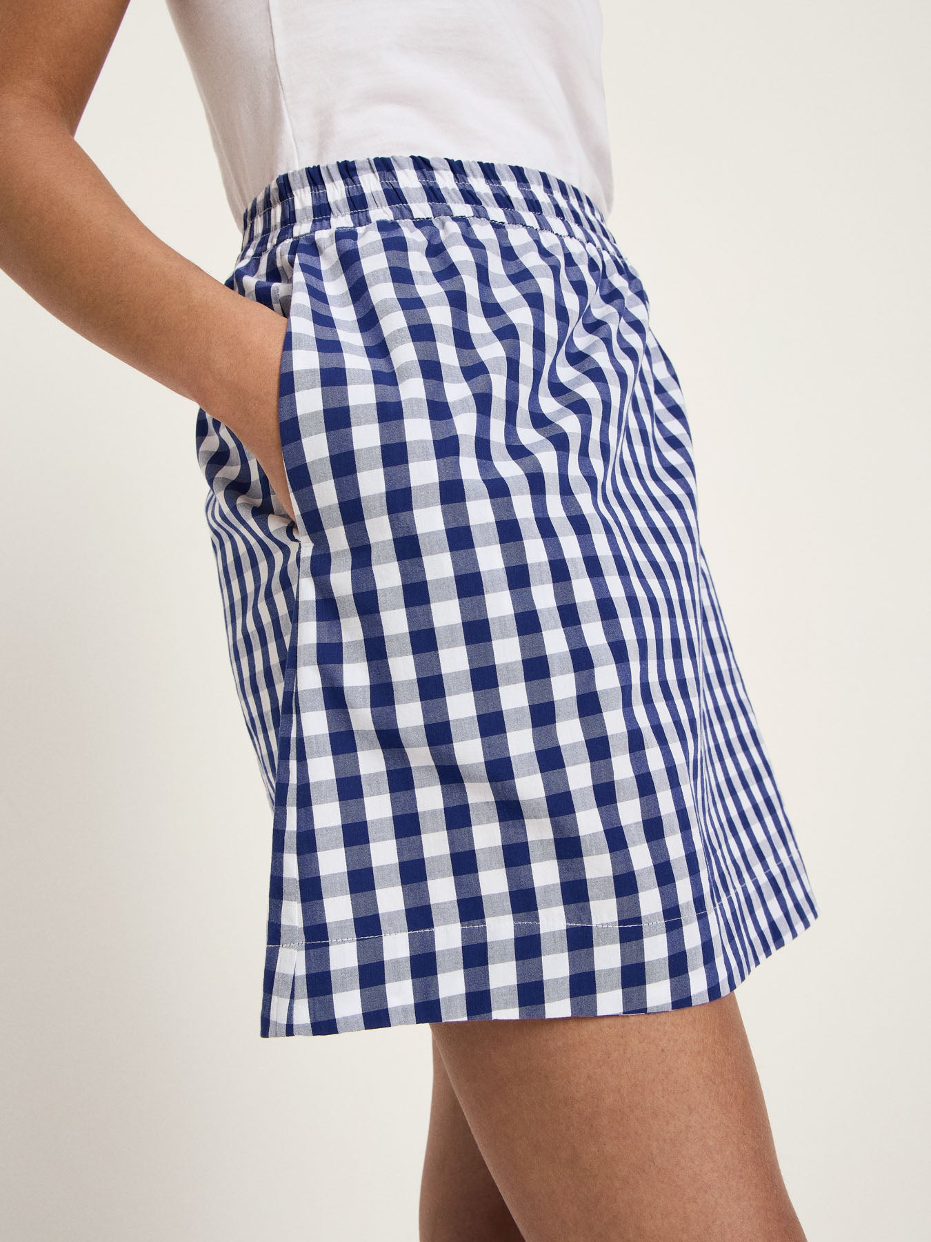 Die kurze, leicht ausgestellte Silhouette sorgt für eine luftige Passform und eine schmeichelhafte Linie, während französische Taschen das Design funktional ergänzen. Der elastische Gummibund bietet zusätzlichen Komfort und ermöglicht ein unkompliziertes An- und Ausziehen.